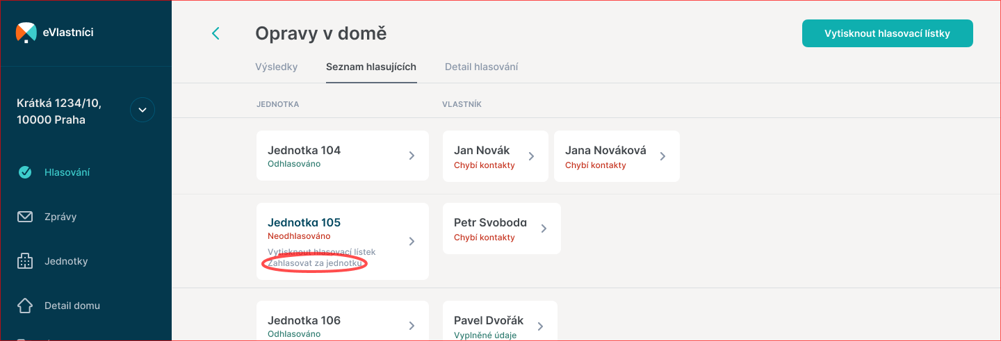 Pomocí této funkce máte možnost zahlasovat za jednotku, jejíž vlastník nechce nebo nemá možnost zahlasovat sám.