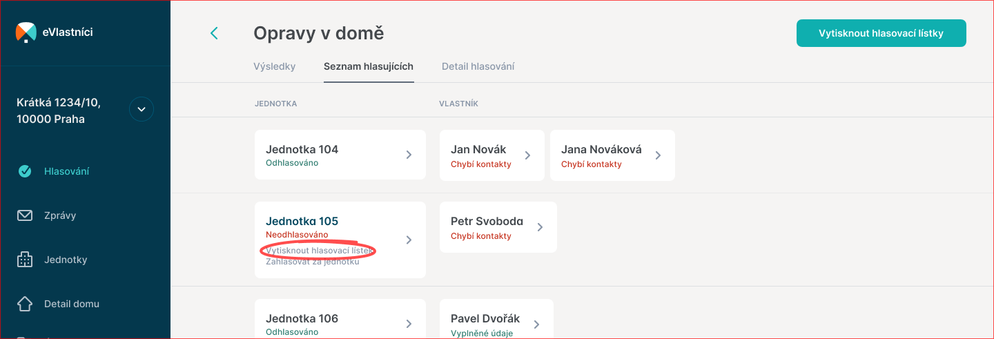 Kliknutím na tlačítko "Vytisknout hlasovací lístek" se vám automaticky stáhne pdf soubor s hlasovacím lístkem pro konkrétní jednotku.
