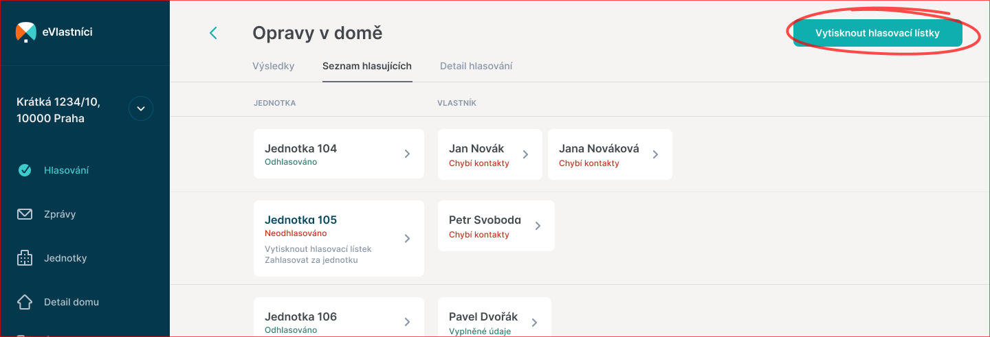 V této záložce naleznete seznam všech jednotek a vlastníků. U každé jednotky je informace, zda již její vlastník zahlasoval v tomto hlasování. A u každého vlastníka informace o stavu jeho kontaktních údajů.
