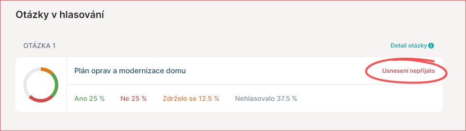 Po datu zveřejnění výsledku hlasování se provede kontrola výsledku, zda bylo usnesení přijato nebo nepřijato, což se následně u hlasování zobrazí. Zároveň se po datu zveřejnění zpřístupní výsledek i ostatním vlastníkům.