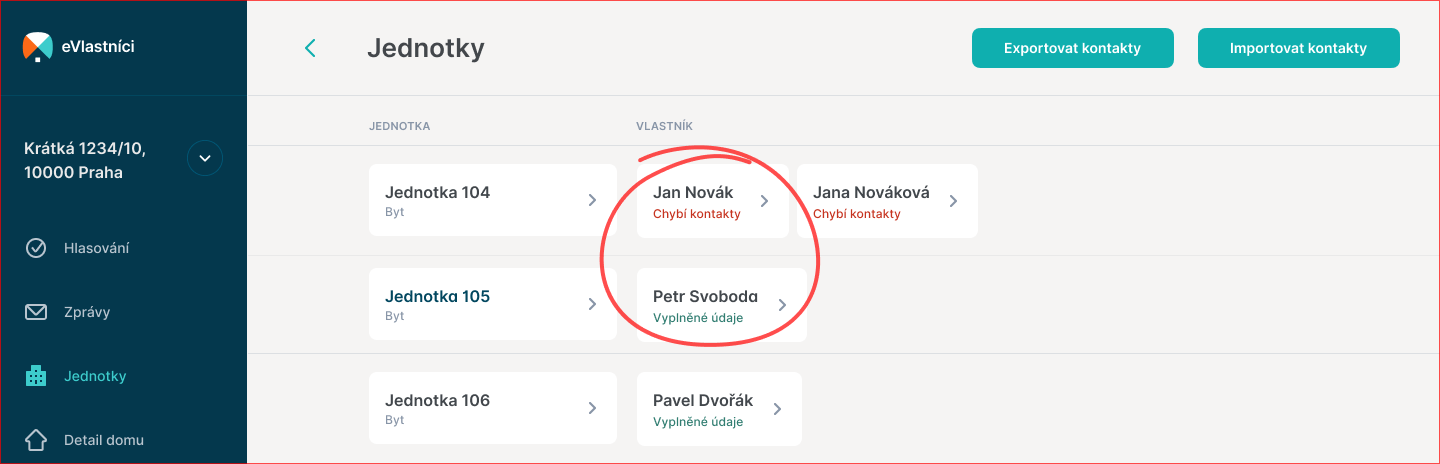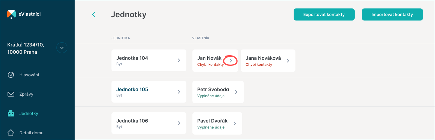 K přehledu jednotek a jejich vlastníků se dostanete skrze položku "Jednotky" v hlavní navigaci.