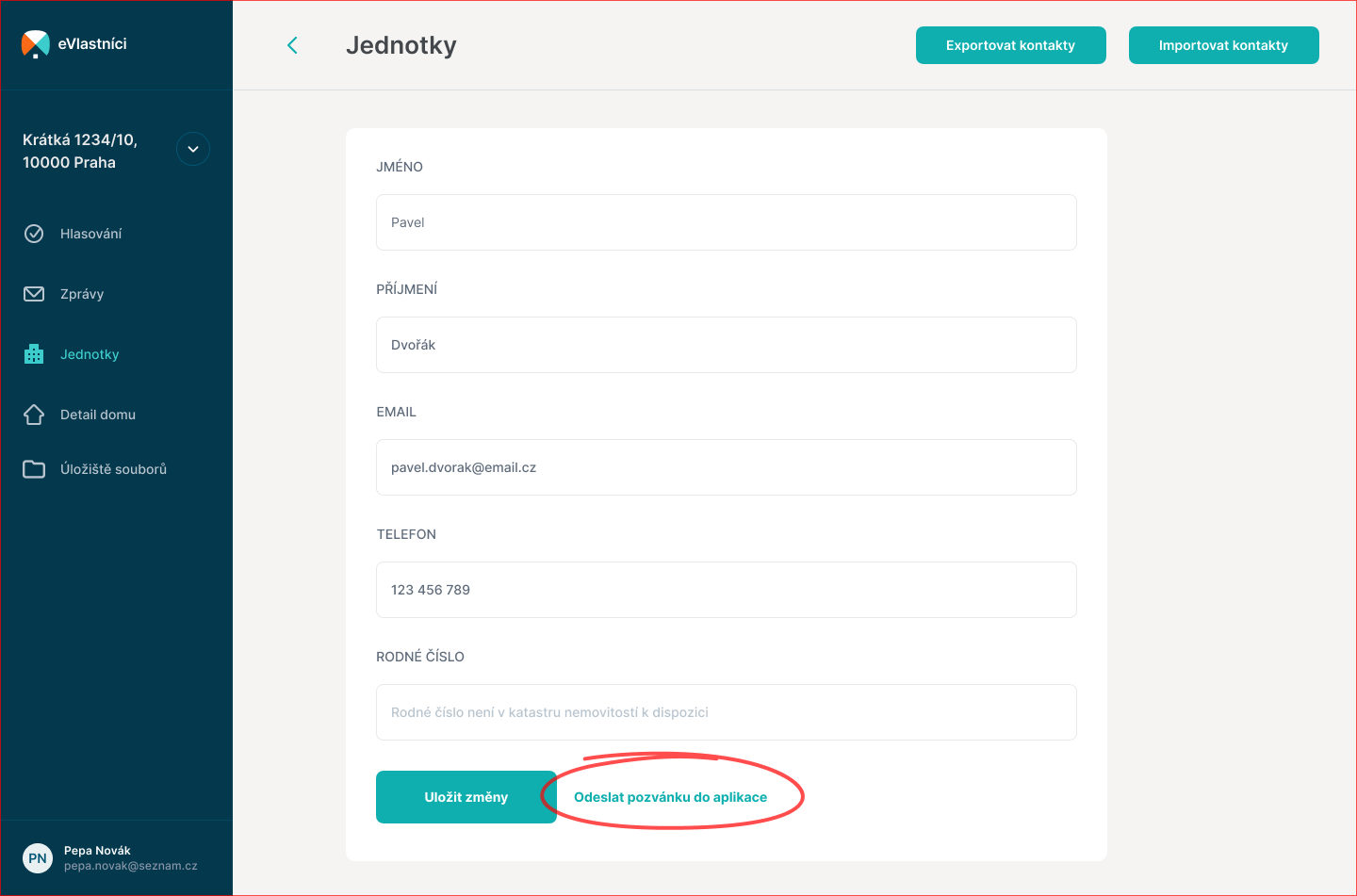 Vyvoláte tak formulář pro editaci údajů o vlastníkovi. Jméno a příjmení editovat nelze. Na vás je doplnění emailu a telefonního čísla. Máte také možnost údaje doplnit hromadně přes funkci Importovat kontakty.