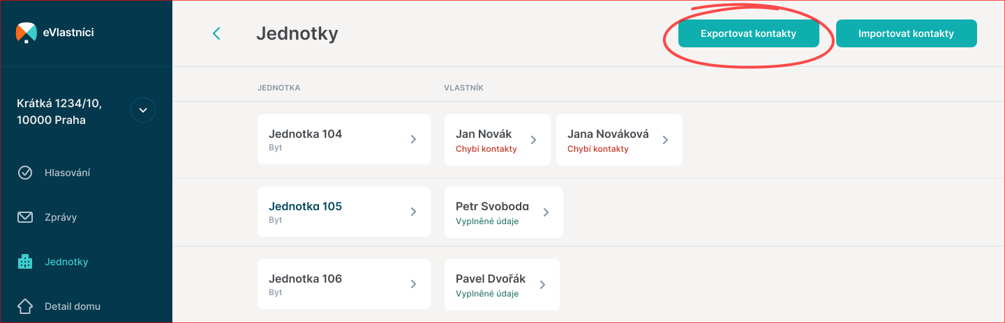 Pomocí této funkce lze hromadně vyexportovat všechny kontakty vlastníků.